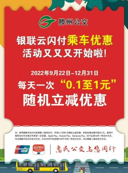 2022年9月22日起至2022年12月31日。使用銀聯(lián)手機(jī)閃付(包括Apple Pay,Huawei Pay,Samsung Pay,Mi Pay等)、云閃付APP二維碼支付、各銀行APP二維碼支付。每用戶每種支付方式每天享受一次“0.1至1元”隨機(jī)立減優(yōu)惠。