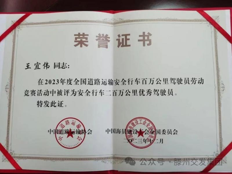 近日,在2023年度全國道路運(yùn)輸安全行車百萬公里駕駛員勞動(dòng)競賽活動(dòng)中,我省共有9名駕駛員獲得“全國道路運(yùn)輸安全行車二百萬公里優(yōu)秀駕駛員”榮譽(yù)稱號,其中滕州市交通發(fā)展集團(tuán)國運(yùn)公司駕駛員王宜偉也獲此殊榮。
