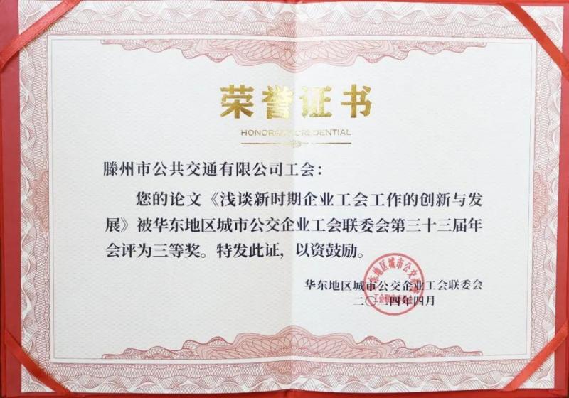 近日,華東地區(qū)城市公交企業(yè)工會聯(lián)委會面向華東地區(qū)六省一市各公交客運(yùn)單位開展優(yōu)秀論文征集,交發(fā)集團(tuán)公交公司工會積極響應(yīng),撰寫的《淺談新時期企業(yè)工會工作的創(chuàng)新與發(fā)展》論文在華東地區(qū)公交企業(yè)工會聯(lián)委會第三十三屆年會上榮獲三等獎。