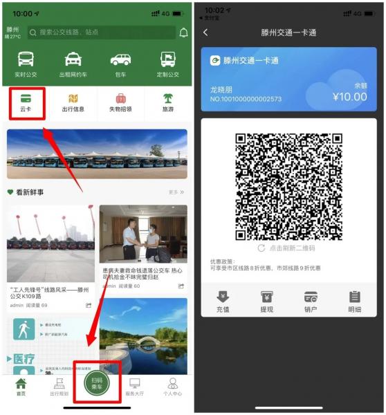 點擊APP首頁“云卡”或“掃碼乘車”,云公交卡支持實名制開通云公交卡,進入頁面后,點擊開通乘車碼服務(wù),進入錢包界面進行充值,支持微信,支付寶,銀行卡方式充值。充值后顯示乘車二維碼,把乘車碼貼近公交車刷卡車載機感應(yīng)區(qū)掃碼乘車即可。