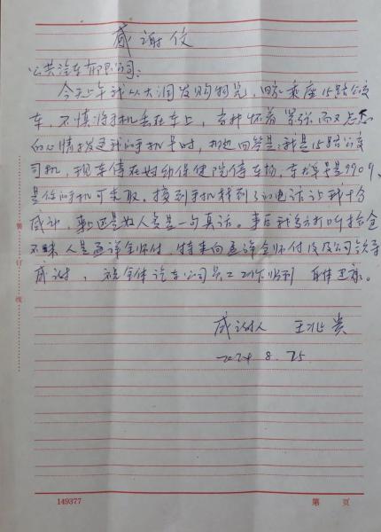 事后王先生心里十分感激,遂寫感謝信一封親自送到公司,感激的說道:“感謝孟師傅拾金不昧的高尚品德,感謝公交公司培養(yǎng)出這么優(yōu)秀的駕駛員”。